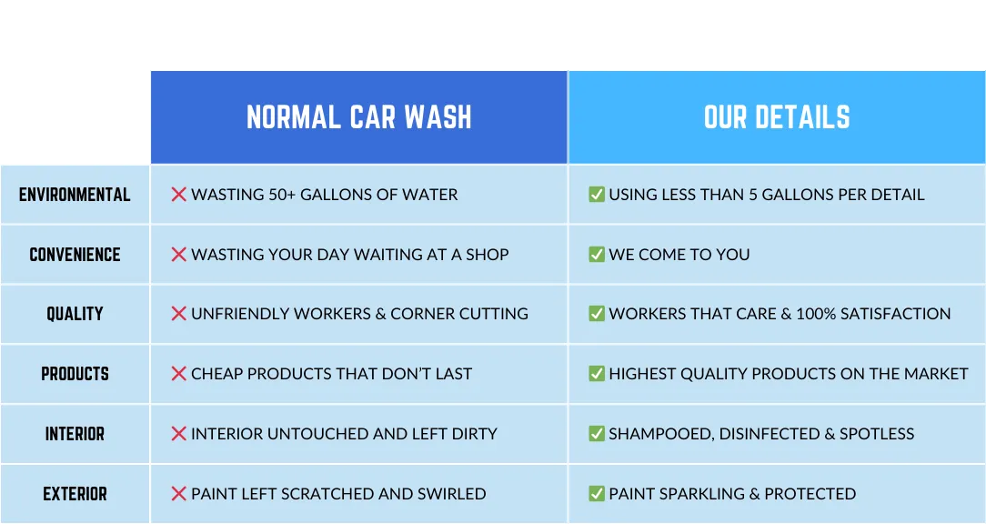 We are one of the few detailing services in Nashville,TN that use biodegradable, eco-friendly products! Our commitment to green solutions sets us apart, ensuring your car looks amazing without the use of harsh chemicals, strong odors, or unsightly stains. Plus, we bring our professional auto detailing services directly to you, saving you time and sparing you from the hassle of sub-par automatic car washes.